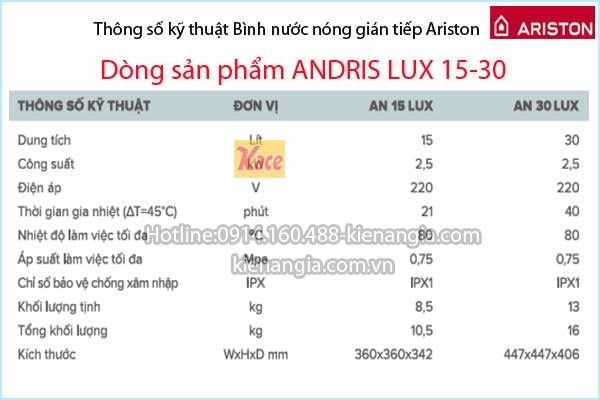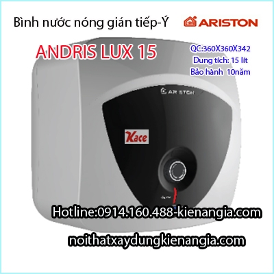 • Bình nước nóng 15 lít Ariston ANDRIS-LUX15​,bình nóng lạnh dùng điện Ariston thương hiệu Ý chính hãng chiết khấu cao KIẾN AN GIA.Bình nước nóng Ariston gián tiếp cho gia đình,căn hộ,khách sạn..dung tích 15-100 Iít tuỳ theo sản phẩm .Dòng máy ANDRIS màu sắc sang trọng theo phong cách Ý an toàn với ELCB, bền vững với lớp men tráng  bình chứa và lớp cách nhiệt mật độ cao, tiện dụng với nút điều chỉnh nhiệt độ. Bạn có thể chọn mua máy nước nóng trực tiếp chính hãng Ariston,Ferroli..chiết khấu cao tại 0914.160.488