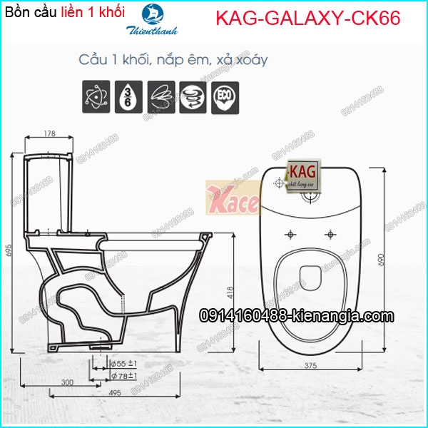 Bồn cầu Vuông 1 khối Thiên Thanh chinh hãng KAG-GALAXY-CK66,bàn cầu liền khối,bệt két liền Thiên Thanh chính hãng chiết khấu cao KIẾN AN GIA.Bồn cầu một khối Thiên Thanh đẹp,gọn,giá rẻ ,công nghệ NANO kháng khuẩn,khó bán bẩn,dễ lau chùi vệ sinh,thích hợp dùng cho gia đình,nhà phố,khách sạn,nhà cho thuê trung cao cấp.Bạn nên chọn mua combo trọn bộ bàn cầu Thiên Thanh,lavabo Thiên Thanh,sen vòi nóng lạnh hay sen vòi lạnh bảo hành 5 năm tại 0914.160.488.Xem Clip sản phẩm TẠI ĐÂY
