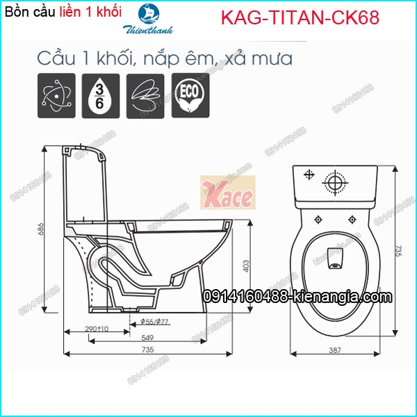 Bồn cầu Vuông 1 khối Thiên Thanh chinh hãng KAG-TITAN-CK68,bàn cầu liền khối,bệt két liền Thiên Thanh chính hãng chiết khấu cao KIẾN AN GIA.Bồn cầu một khối Thiên Thanh đẹp,gọn,giá rẻ ,công nghệ NANO kháng khuẩn,khó bán bẩn,dễ lau chùi vệ sinh,thích hợp dùng cho gia đình,nhà phố,khách sạn,nhà cho thuê trung cao cấp.Bạn nên chọn mua combo trọn bộ bàn cầu Thiên Thanh,lavabo Thiên Thanh,sen vòi nóng lạnh hay sen vòi lạnh bảo hành 5 năm tại 0914.160.488.Xem Clip sản phẩm TẠI ĐÂY