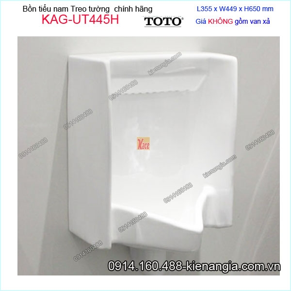 Bồn tiểu nam treo tường TOTO chính hãng 355x449x655 mm KAG-UT445H,bệ tiểu nam treo tường,tiểu nam TOTO chính hãng cho gia đình,căn hộ,khách sạn,resort,khu công cộng ...men sứ chống dính, chống bám bẩn vượt trội CEFIONTECT CEFIONTECT.Chế độ xả trải đều mạnh mẽ, tiết kiệm nước,giá tốt KIẾN AN GIA-0914160488.Xem clip bộ sưu tập tiểu nam TOTO TẠI ĐÂY