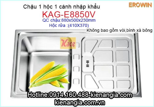 • Chậu inox Erowin 1 hộc vuông 1 cánh KAG-E8850V kiểu dáng hiện đại,mẫu mới 2017,bồn rửa chén inox,chậu rửa chén nhập khẩu,chính hãng,chiết khấu cao KIẾN AN GIA.Chậu dày,sâu,kiểu dáng đẹp,thoát nước nhanh,chống hôi tốt,dễ vệ sinh,khó trấu xước.Mua thêm vòi rửa chén nóng lạnh hoặc vòi bếp lạnh tại 0914160488