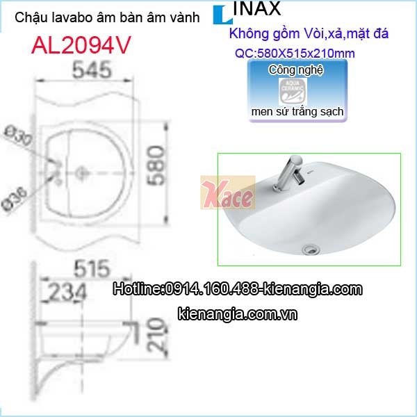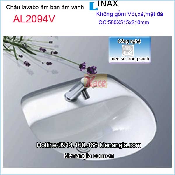 Lavabo âm bàn âm vành Aquaceramic Inax AL2094V,chậu rửa mặt âm bàn Inax,lavabo âm mặt đá Inax men sáng bóng công nghệ Aqua ceramic siêu sạch, chính hãng chiết khấu cao giá rẻ KIẾN AN GIA-0914.160.488 cho phòng tắm nhà phố,khách sạn,resort,biệt thự rất đẹp,sang trọng .Dùng kết hợp với vòi lavabo nóng lạnh hay vòi lạnh đều đẹp