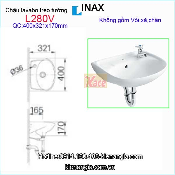 Lavabo nhỏ treo tường INAX L280V,chậu rửa treo tường Inax,công nghệ men trắng sáng khó bám bẩn chính hãng INAX chiết khấu cao KIẾN AN GIA,thích hợp cùng cho phòng tắm gia đình,nhà phố,nhà cho thuê,căn hộ,khách sạn.Chậu lavabo Inax có thể dùng vòi lạnh hay vòi nóng lạnh đều được tùy theo hệ thống cấp nước.Lavabo này nhỏ gọn không chiếm không gian