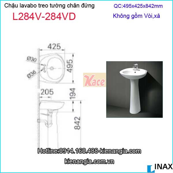 • Lavabo treo tường có chân đứng INAX L284V-L284VD,chậu rửa mặt Inax chân dài rất chắc chắn,an toàn cho người già ,trẻ em và thích hợp cho trường học,khu công cộng,khách sạn.Chậu lavabo Inax có thể dùng vòi nóng lạnh hay vòi lạnh.Men sứ bóng sáng,dễ vệ sinh,chính hãng Inax chiết khấu cao KIẾN AN GIA 0914.160.488