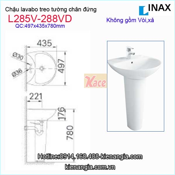 Lavabo treo tường có chân đứng INAX L285V-L288VD,chậu rửa mặt Inax chân dài rất chắc chắn,an toàn cho người già ,trẻ em và thích hợp cho trường học,khu công cộng,khách sạn.Chậu lavabo Inax có thể dùng vòi nóng lạnh hay vòi lạnh.Men sứ bóng sáng,dễ vệ sinh,chính hãng Inax chiết khấu cao KIẾN AN GIA 0914.160.488