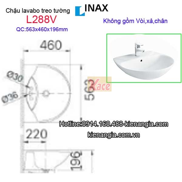 Lavabo treo tường INAX L288V,chậu rửa treo tường Inax,công nghệ men trắng sáng khó bám bẩn chính hãng INAX chiết khấu cao KIẾN AN GIA,thích hợp cùng cho phòng tắm gia đình,nhà phố,nhà cho thuê,căn hộ,khách sạn.Chậu lavabo Inax có thể dùng vòi lạnh hay vòi nóng lạnh đều được tùy theo hệ thống cấp nước.