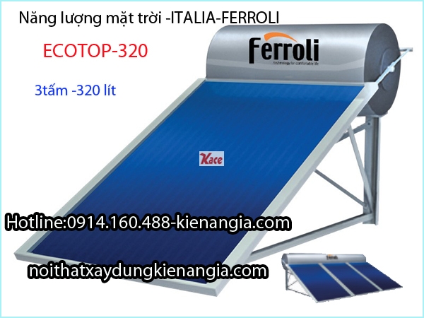 • NLMT tấm thu nhiệt Italia-Ferroli ECOTOP-320​ nhập khẩu chính hãng chiết khấu cao KIẾN AN GIA.Dùng máy năng lượng mặt trời tiết kiệm chi phí điện,an toàn cho gia đình,khách sạn,resort,biệt thự...NMMT Ferroli có giá đỡ bằng nhôm không rỉ sét.Tấm hấp thụ nhiệt tráng oxit-titan chống ăn mòn, kính cường lực không phản chiếu,chịu được mưa đá,hiệu suất hấp thụ cao.Lớp vỏ cách nhiệt bằng polyurethane Huntsman của Mỹ giữ nhiệt 72h.Vỏ bình bằng thép sơn mạ tĩnh điện, bền đẹp, chống sốc, chống va đập.
