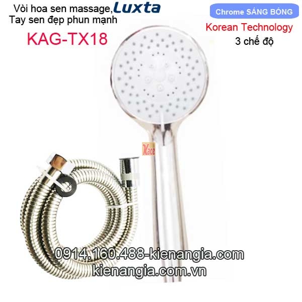 Tay sen,vòi hoa sen Korea-Luxta KAG-TX18 dùng với vòi sen lạnh,vòi sen nóng lạnh,máy nước nóng đều tốt.Tay sen Luxta đẹp,tia nước phun đẹp,mạnh.Nguồn nước đủ áp lực sẽ cho tia massage tuyệt vời,giá rẻ,chiết khấu cao KIẾN AN GIA-0914.160.488.Xem clip sản phẩm THẬT TẠI ĐÂY