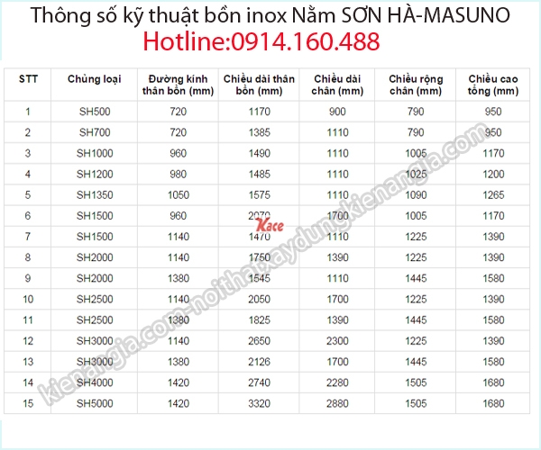 Thông số kỹ thuật bồn inox nằm Sơn Hà-Masuno